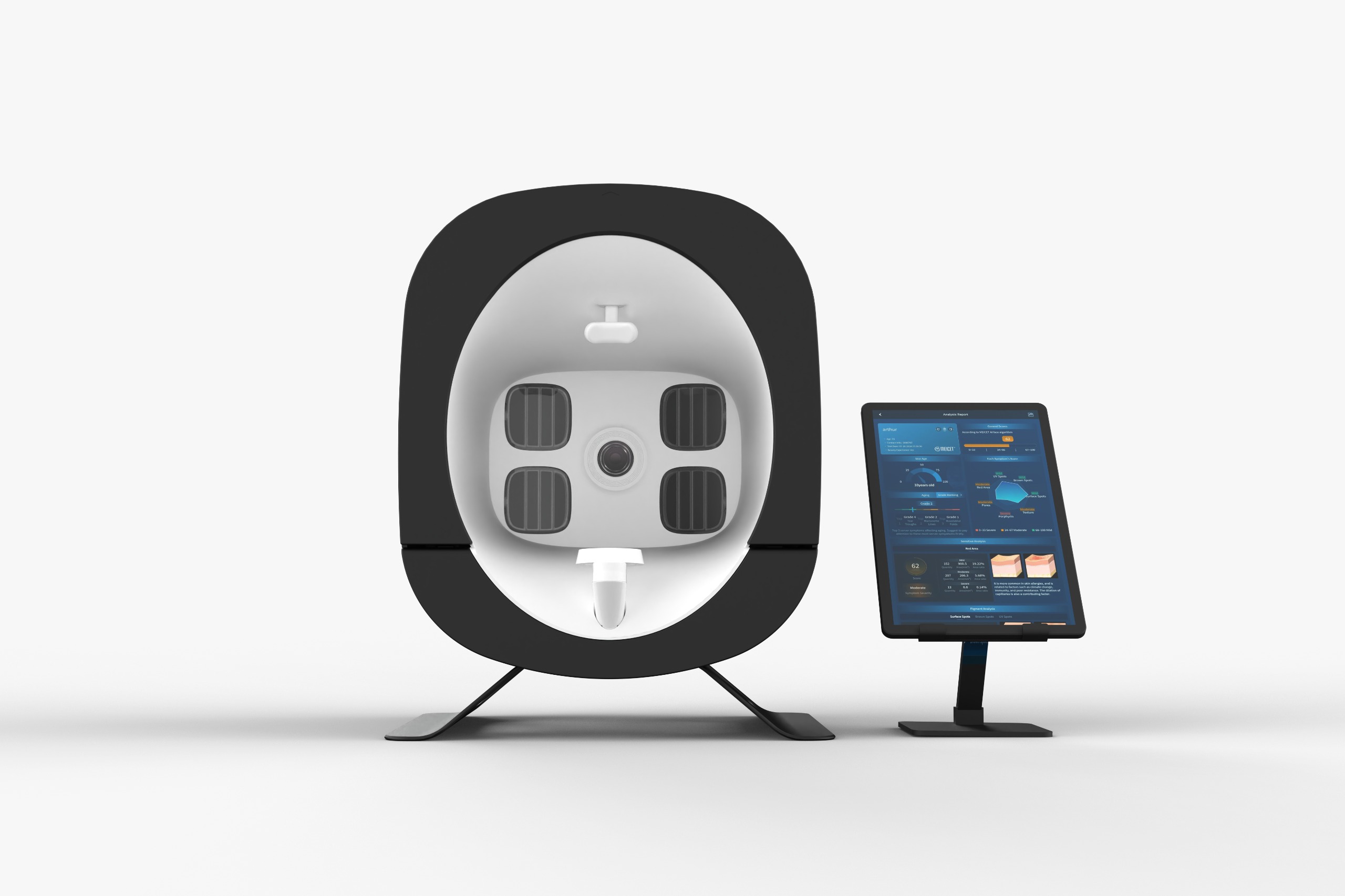 Na podstawie tych informacji generowany jest kompleksowy raport zawierający m.in. wiek skóry, ogólny wynik kondycji cery oraz rekomendacje pielęgnacyjne i zabiegowe.