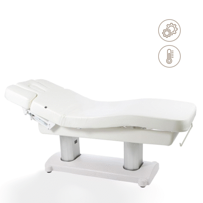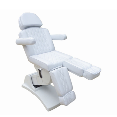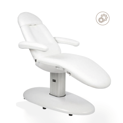Wysokiej klasy fotel podologiczny wyposażony w 3 silniki, które kontrolują wysokość, kąt nachylenia oparcia oraz kąt nachylenia siedziska. Posiada składane podłokietniki i regulowaną poduszkę zagłówka z wieloma wstępnie ustawionymi pozycjami. Podnóżki mają niezależną regulację wysokości za pomocą sprężyny gazowej i oferują boczne otwarcie w dwóch wstępnie ustawionych pozycjach, aż do 90°. Szara tapicerka z wysokiej jakości poliuretanu (PU), ułatwia utrzymanie czystości.