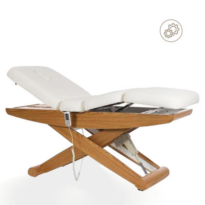 Łóżko spa z 4 silnikami, które regulują wysokość oraz pochylenie oparcia, podnóżka i całego łóżka. Wyjątkowo wygodna wyściółka z wysokiej jakości tapicerką z białej skóry PU. Jednoczęściowy materac z 3 sekcjami.