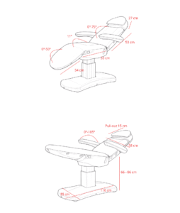 - Zagłówek: Wyposażony w wyjmowany zagłówek z możliwością wysunięcia o 15 cm, co pozwala na dostosowanie fotela do wzrostu klienta i komfortowe ułożenie podczas zabiegów.